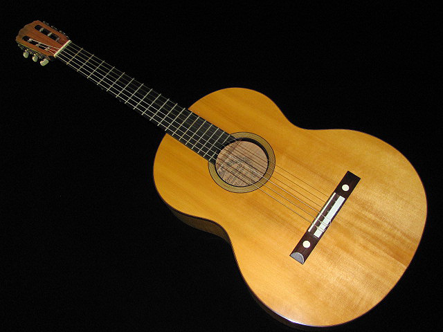 これはハウザー3世が夢に出てきたというギターを作品にしたとの事ですが、通常の裏板では無くて、真ん中にメイプルをいれたとても美しいギターです。また、一目見ていただければお解りですが、使用しているメイプルの美しい事といったら・・・とても素晴らしいのです。